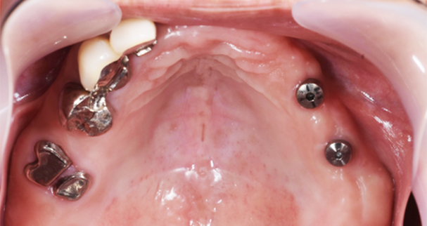 歯が右側にしか残っておらず、このまま噛むと部分入れ歯は左側に沈み込んでしまいます。そこで左側にインプラントを利用して、部分入れ歯が左側に沈み込まないようにしました。